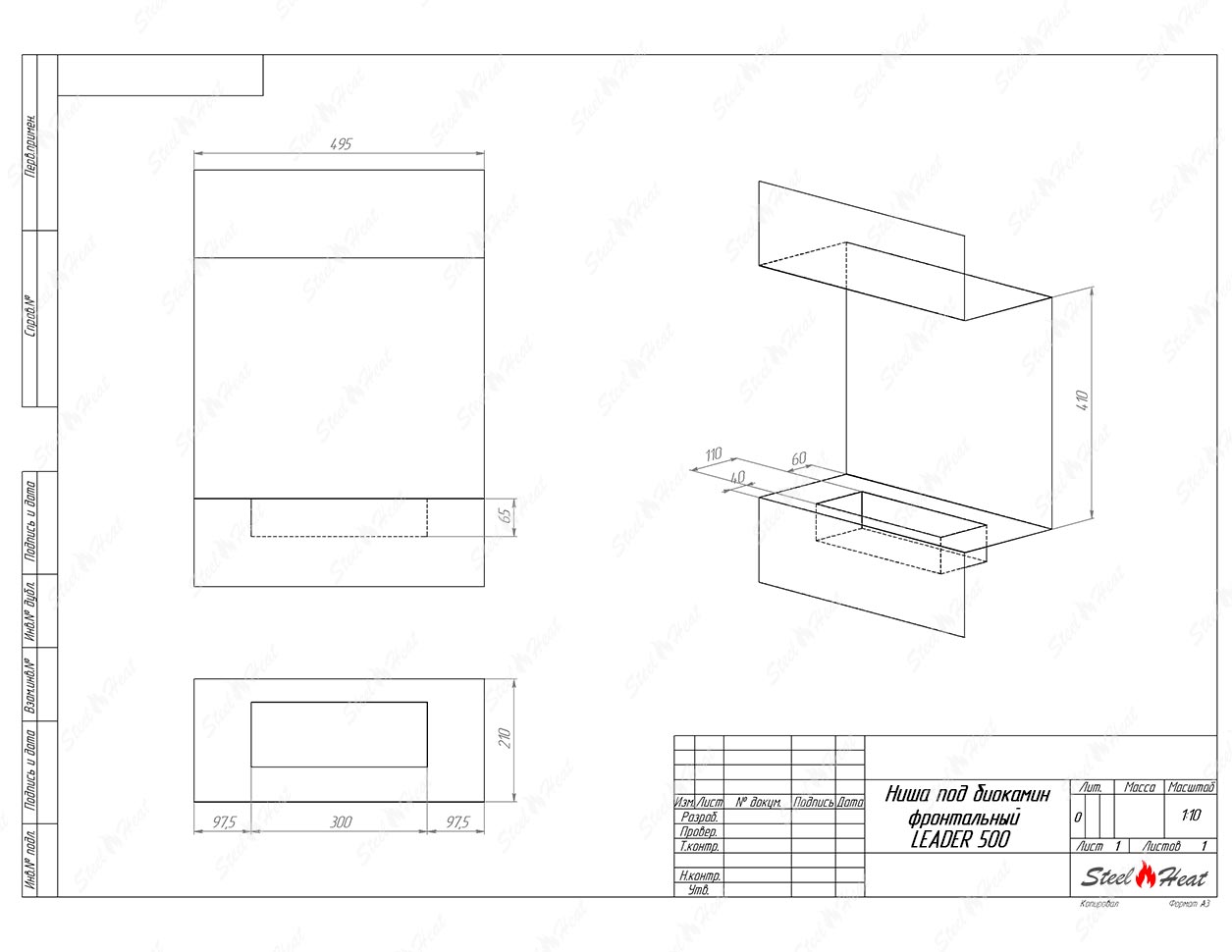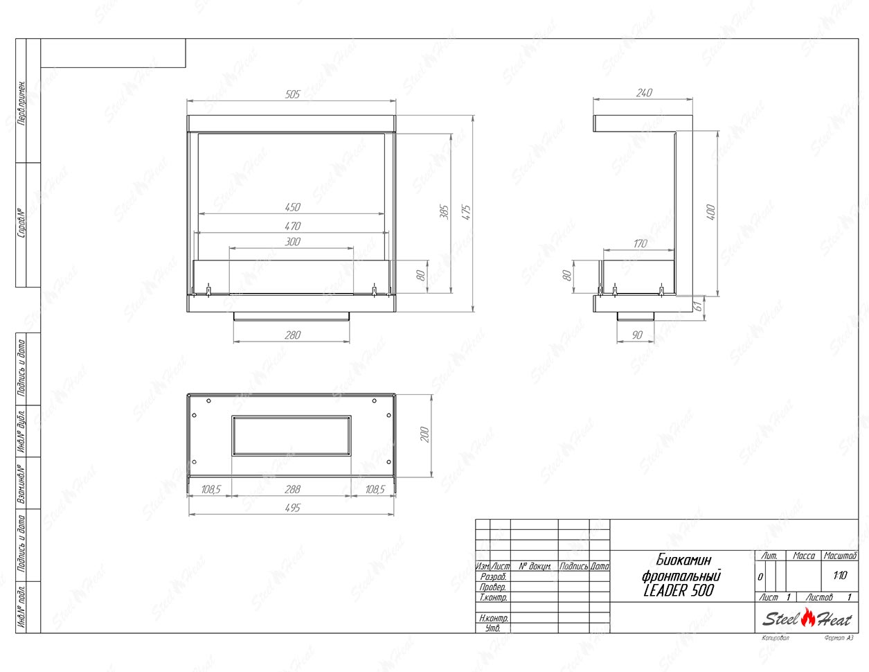 Встраиваемый Биокамин фронтальный SteelHeat Leader 500 предназначен для встраивания в глухие ниши из гипсокартона, кирпича, пеноблоков, бетона.