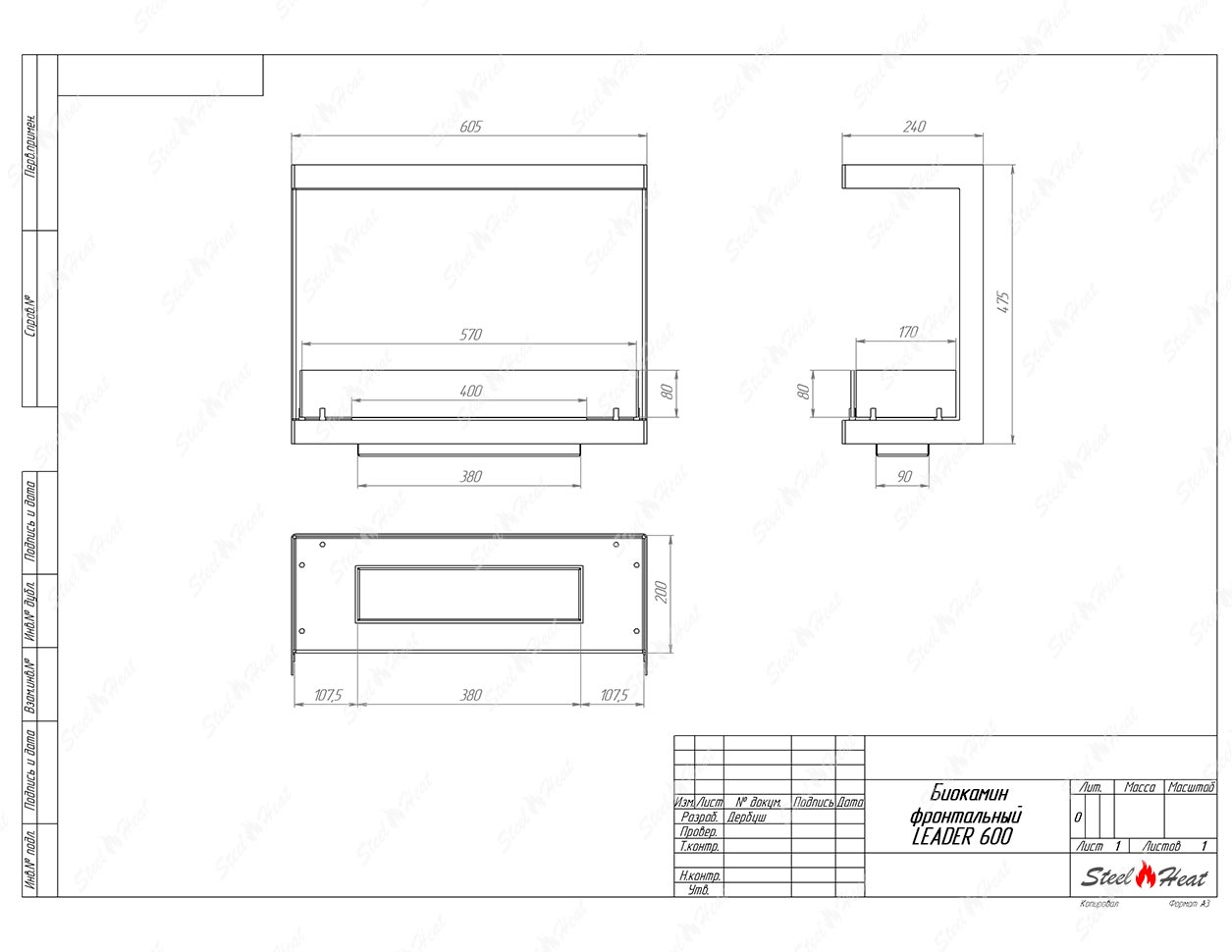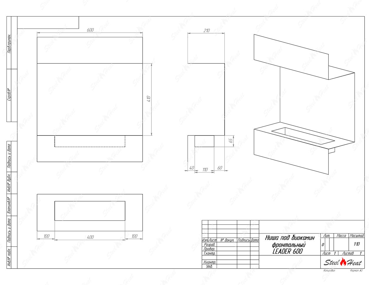 Встраиваемый Биокамин фронтальный SteelHeat Leader 600 предназначен для встраивания в глухие ниши из гипсокартона, кирпича, пеноблоков, бетона.