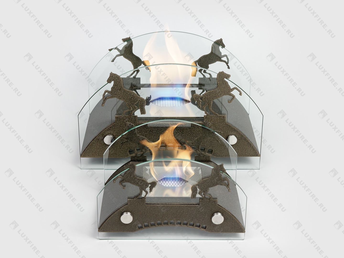Представляет собой биокамин, который создан по мотивам мостов дореволюционной России середины ХIX-начала XX века и состоит из металлического корпуса с топливным блоком Lux Fire 100-1 огражденным с двух сторон скругленными защитными стеклами на дистанционных держателях и декоративными металлическими накладками в виде «Коней»