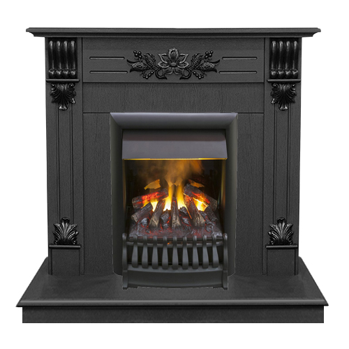 При украшении камина использована классическая античная резьба. Пилястры по бокам от очага оформлены резьбой, выполненной в форме виноградных листьев. Над ними расположились резные консоли, которые визуально поддерживают каминную крышку. Крышка камина плоская, т.е. в ней отсутствует карниз. Поэтому на ее поверхности можно расположить различные декоративные элементы, например, часы или красивые старинные подсвечники. Верхняя панель над очагом оформлена резным травяным орнаментом, выполненным также в классическом стиле. Устанавливается портал на невысокий постамент, который приподнимает его над поверхностью пола.