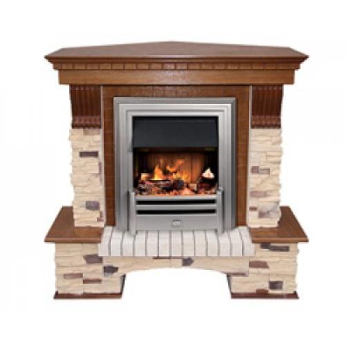 Угловой каминокомплект «Pierre Luxe», оформленный современным очагом «Opti-Myst Cavendish» является отличным вариантом в том случае, если в вашем помещении имеется незанятый угол. За счет угловой конструкции этот довольно массивный камин смотрится компактно и практически не занимает в помещении место. Дизайном портал имитирует внешний вид каминов, устанавливаемых в сельских домах старинной Европы. Но в нем использованы более современные материалы, позволяющие облегчить конструкцию камина. Это значительно упрощает его установку и транспортировку. Боковины и основание портала облицованы материалом, имитирующим сланец. Декоративные элементы выполнены также из МДФ. За счет отличной обрабатываемости материала эти элементы получилось украсить искусной резьбой. Покрыты они натуральным шпоном, имитирующим фактуру и расцветку темного дуба.