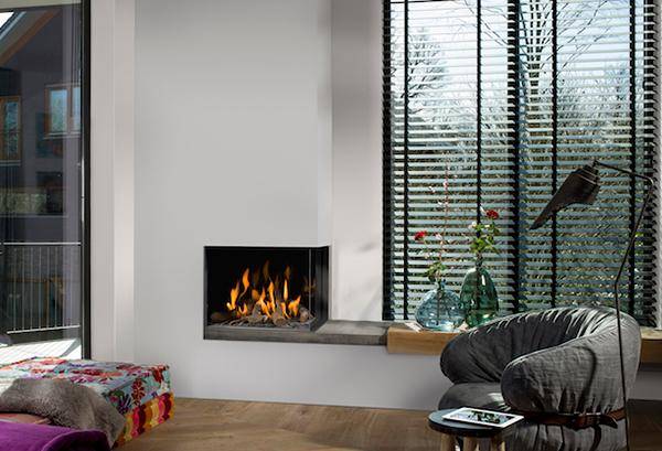 Пристенно-угловой камин Corner Bell Small 3 оборудован закрытой топкой с газовой горелкой. Топка имеет дверь с угловым стеклом.